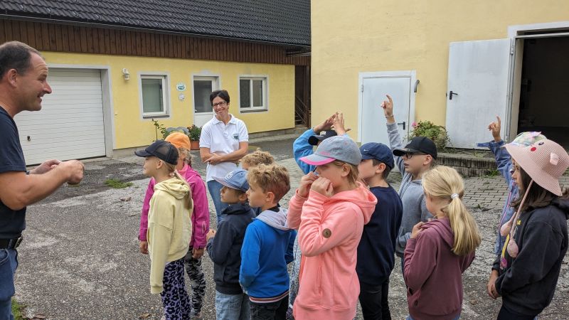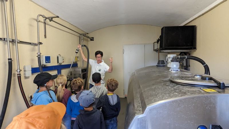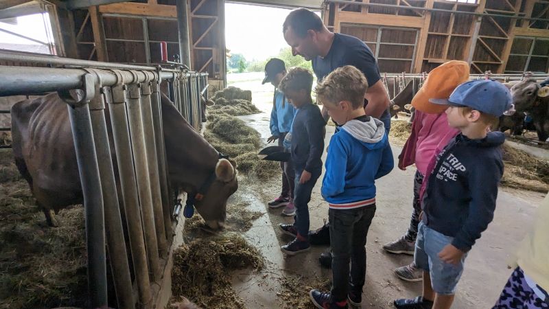 Die Kinder waren voller Vorfreude auf diesen Ausflug, bei dem sie hautnah erleben konnten, wie die Milch, die sie täglich in der Schule trinken, tatsächlich hergestellt wird. Die Schülerinnen und Schüler konnten nicht nur den Hof besichtigen, sondern auch die Tiere streicheln und ihnen beim Fressen zusehen.