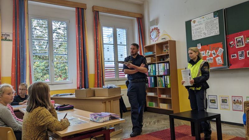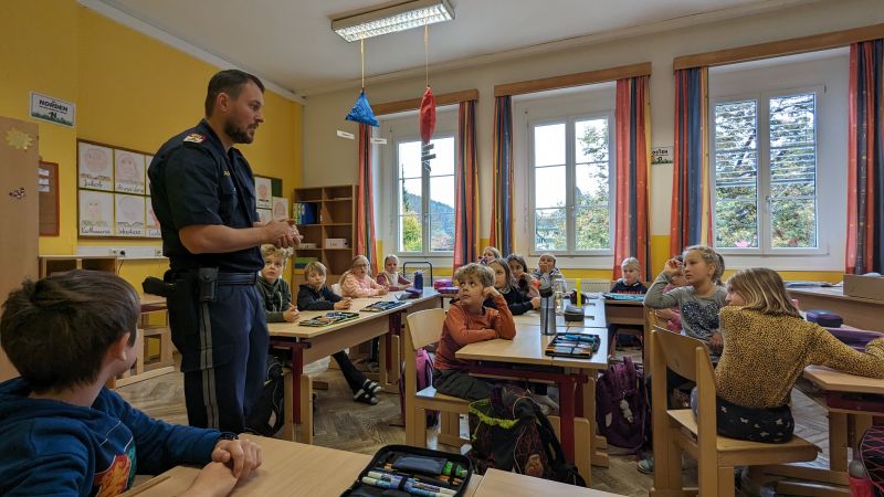 Vor Kurzem waren zwei Polizeibeamte bei den Schülerinnen und Schülern der 3. Schulstufe zu Besuch. Dabei wurden die Kinder zu Kinderpolizisten ausgebildet. Nach der umfassenden Ausbildung wurden ihnen die Kinderpolizei-Ausweise ausgehändigt. Damit wurden die kleinen „Nachwuchsbeamten“ ermächtigt, Erwachsene darauf hinzuweisen, wenn sie am Steuer ein Handygespräch führen oder den Sicherheitsgurt nicht anlegen. Die Kinder erhielten den Auftrag, mit offenen Augen durch die Welt zu gehen, um sie sicherer zu machen.