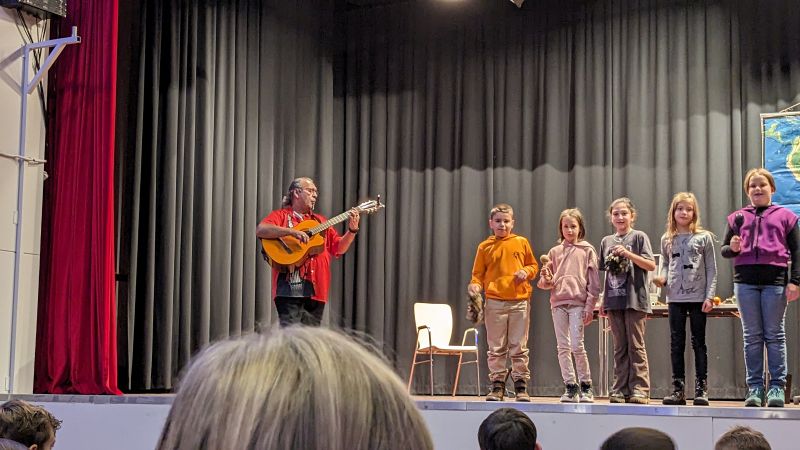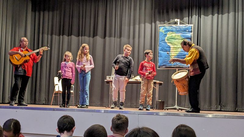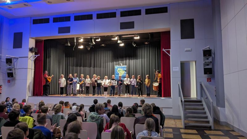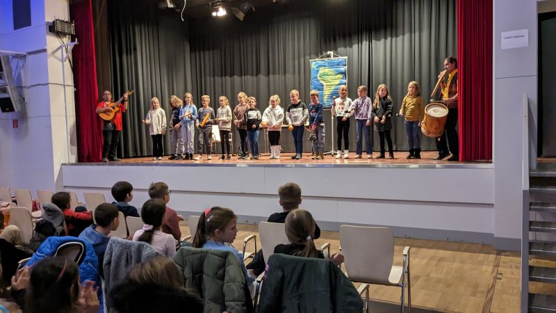 Die beiden Musiker zeigten verschiedene Musikinstrumente, wie die Panflöte, die Kena oder Rasseln aus Tierhufen und unterhielten uns mit südamerikanischen Klängen. Am Ende durften die Kinder sogar mitmusizieren und damit die vielfältige Musik des lateinamerikanischen Kontinents kennenlernen.
