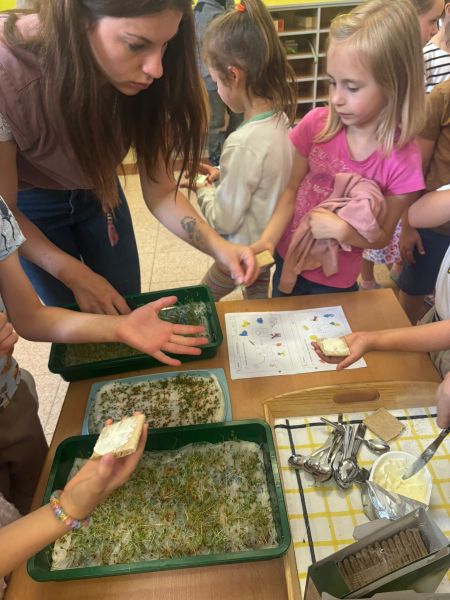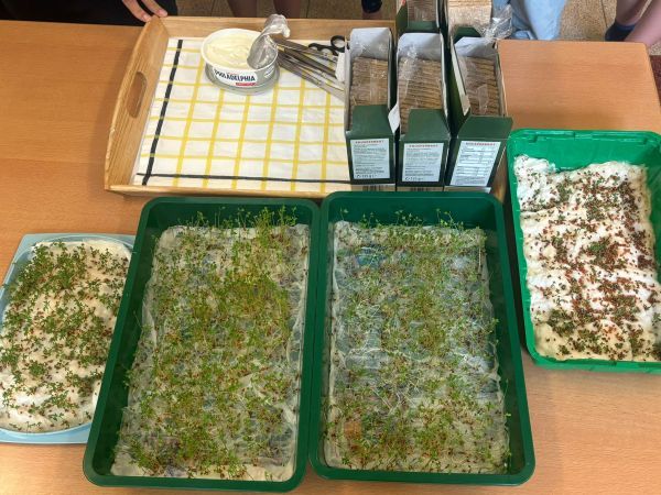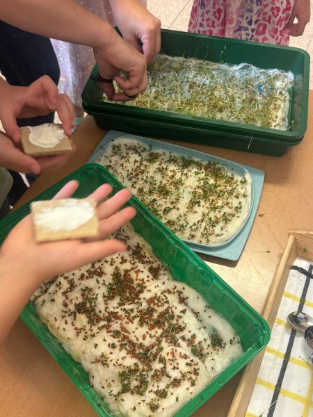 Die drei ersten Klassen haben im Laufe des Schuljahres viel über die „Gesunde Jause“ gelernt und so wurde auch eigene Kresse angebaut.
