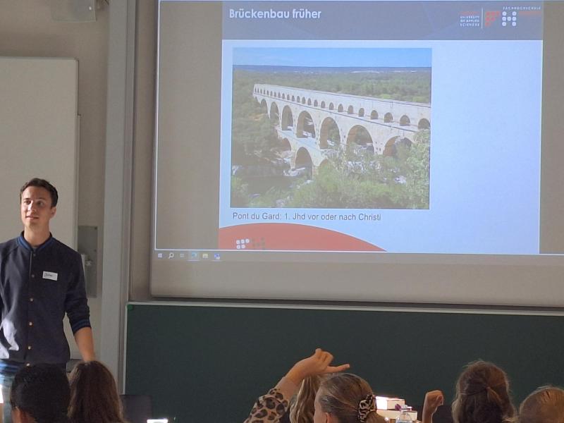 Bevor es ans Praktische ging, vermittelte uns Julian in einer Präsentation Wichtiges über Brücken. Warum baut man Brücken? Welche Brücken gibt es? Wie sah der Brückenbau früher aus? – diesen Fragen gingen wir mit viel Interesse nach.