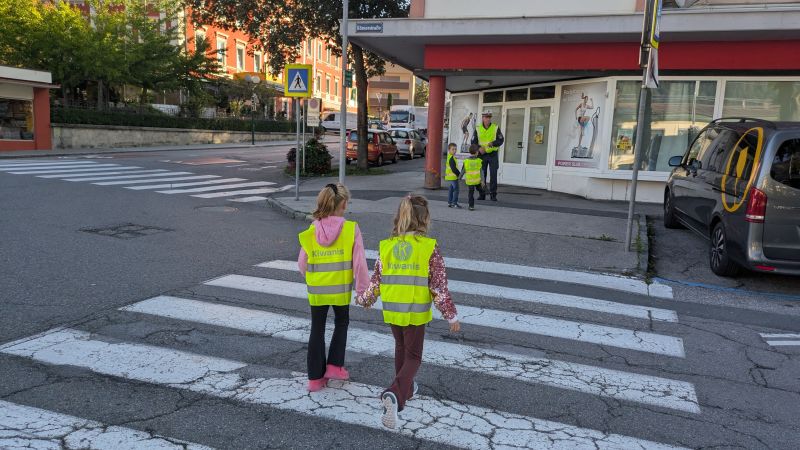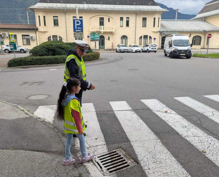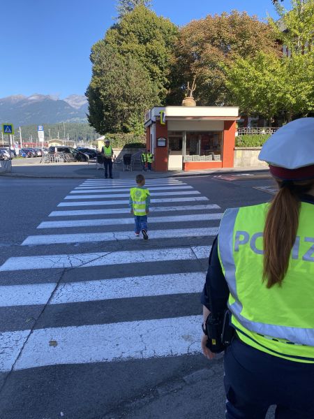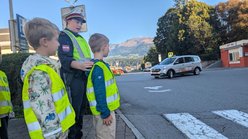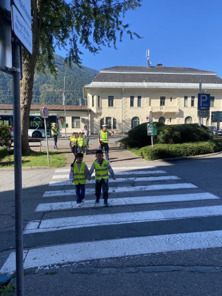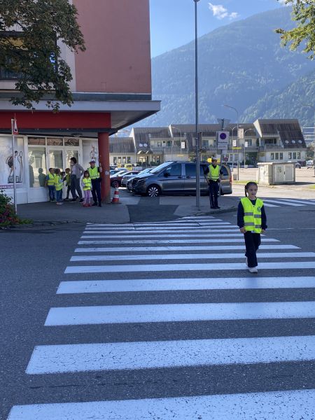 Nach einer kurzen Einführung im Klassenraum ging es gemeinsam nach draußen, wo das Gelernte direkt angewendet werden konnte. Besonders spannend war das sichere Überqueren der Straße – alleine oder zu zweit – bei dem die Kinder genau übten, worauf sie achten müssen.
