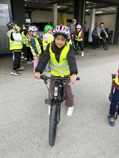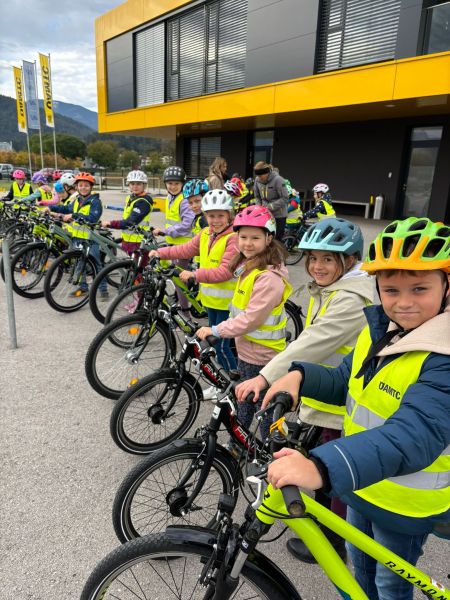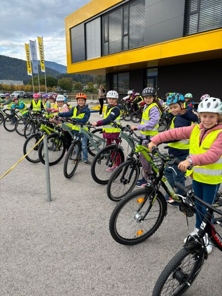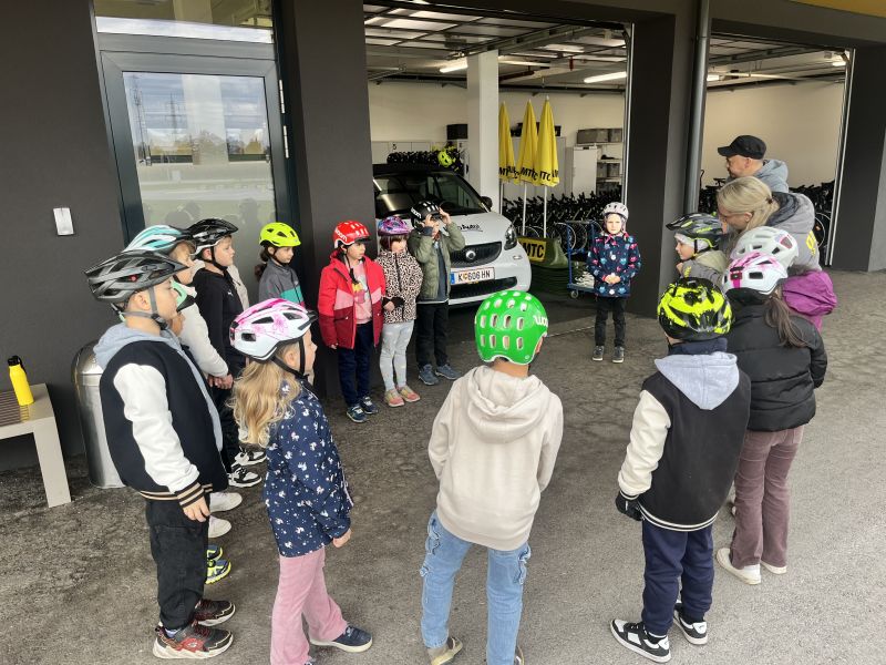 Die 3. Klasse meisterte einen Radparcours, bei dem das sichere Fahren trainiert und theoretisch besprochen wurde. Anschließend folgte der Workshop „Hallo Auto“, bei dem die Kinder das Bremsverhalten von Fahrzeugen und wichtige Gefahren im Straßenverkehr besser verstehen konnten.